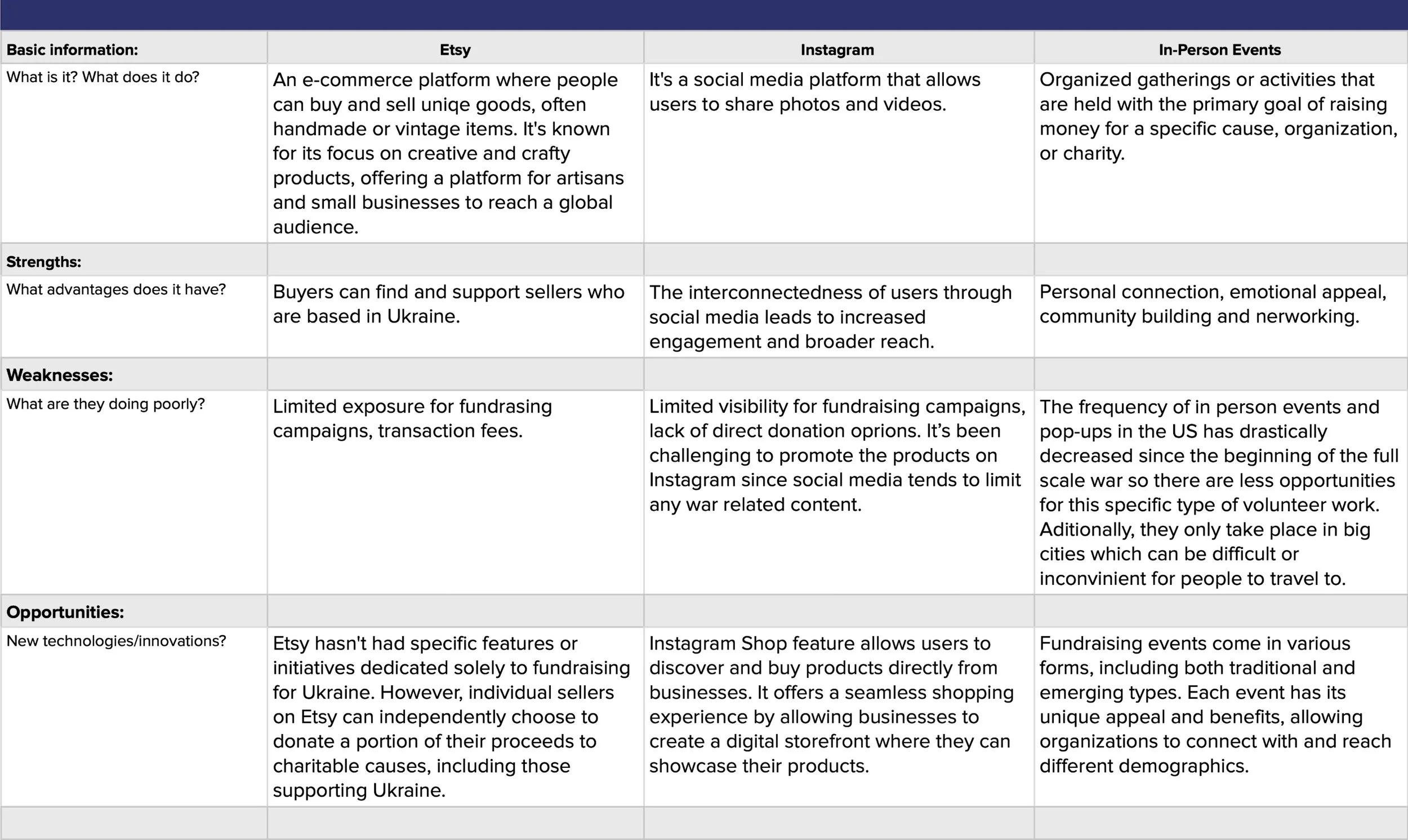 When it came to secondary research, I studied resources available online, mainly video interviews of independent volunteers, as well as volunteer organizations based in Ukraine. The videos showed their daily process of how they volunteer, how they collect donations, and what they do with them (e.g., buy ammunition and deliver it to battlefields).