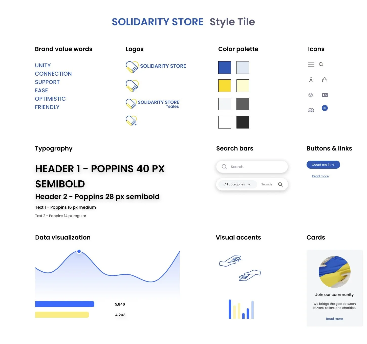 For the color palette, I went with the colors of the Ukrainian flag - blue and yellow - and their variations, as well as neutral colors to make the primary colors stand out.